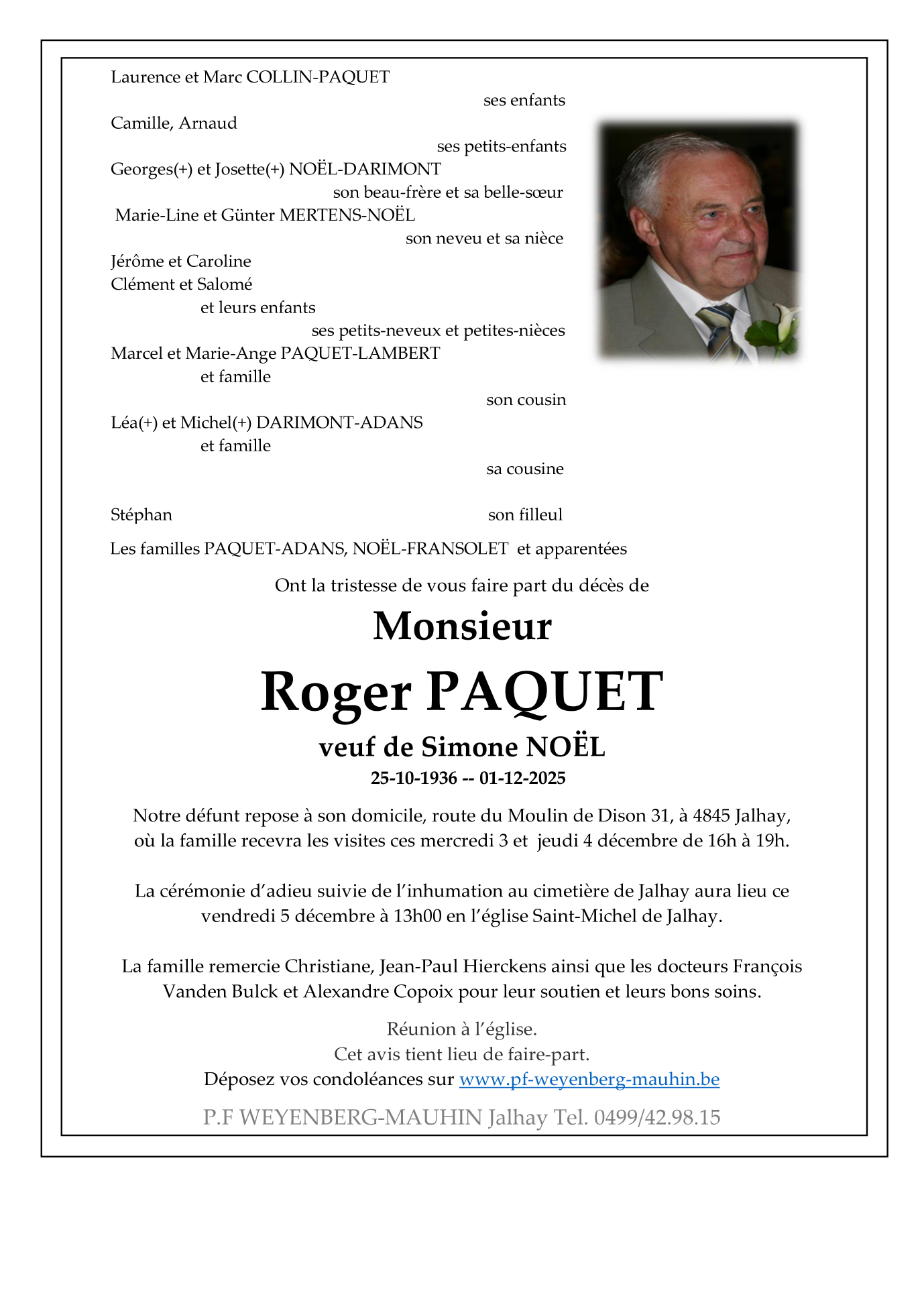 Décédé à Jalhay (4845) le lundi 1 décembre 2025 à l'âge de 89 ans
