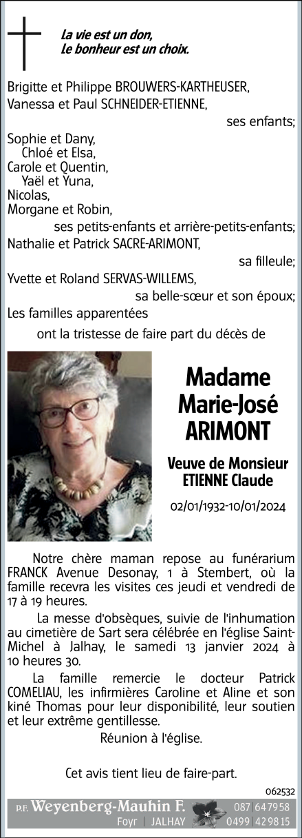 Décédée à Jalhay (4845) le mercredi 10 janvier 2024 à l'âge de 92 ans