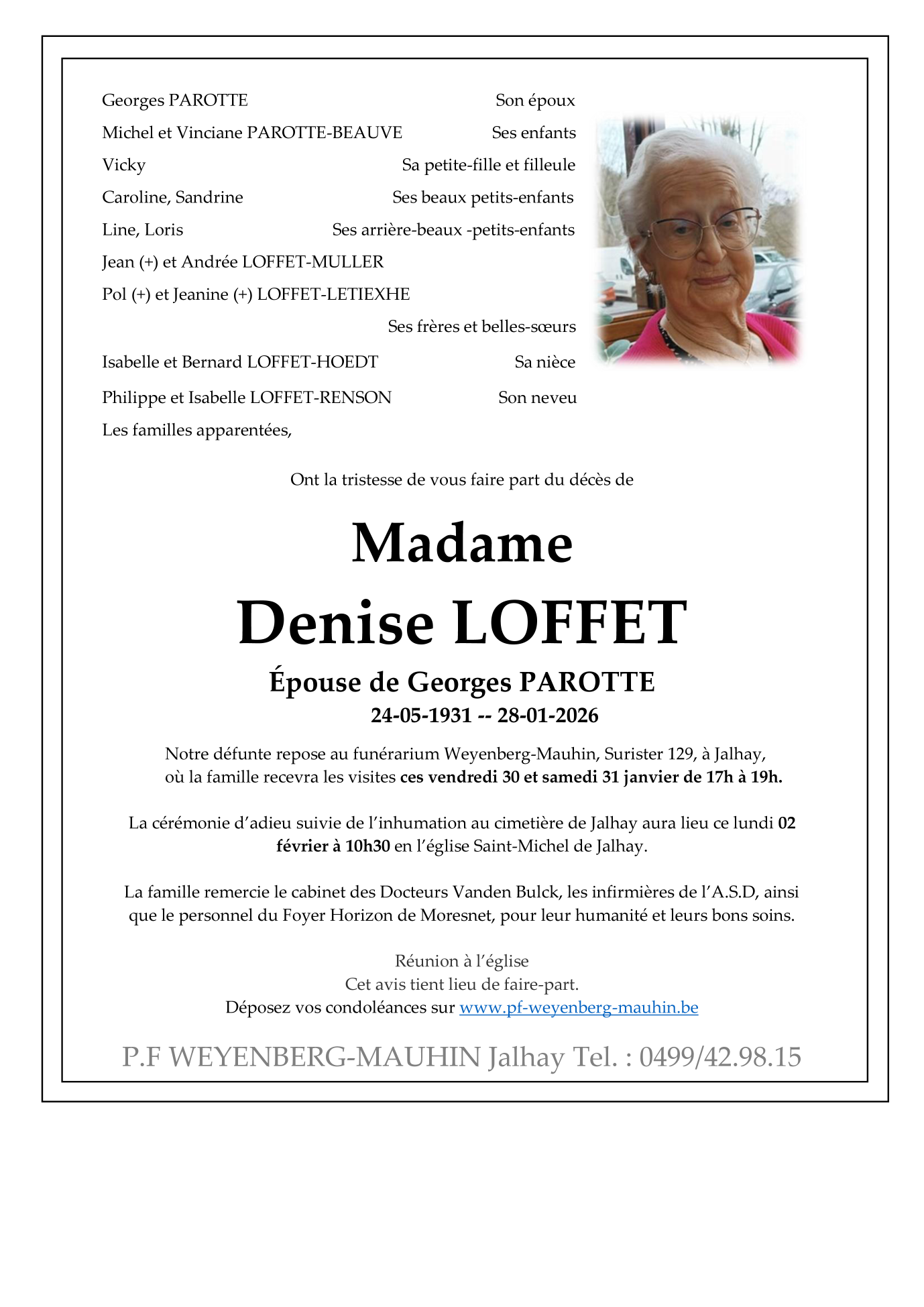 Décédée à Plombières (4850) le mercredi 28 janvier 2026 à l'âge de 94 ans
